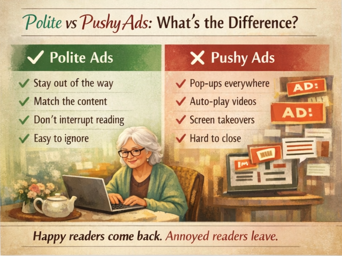 If you’re just starting out—or even rebuilding your site like I’ve been doing—you don’t need to jump into aggressive ad networks right away. Honestly, I’ve found a much calmer approach works better: